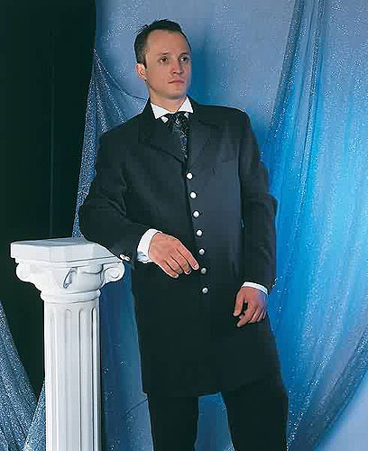 Azonos anyagból készült együttes. A kétrészes öltöny zakóból és nadrágból áll, a háromrészes pedig zakóból, nadrágból és mellényből.